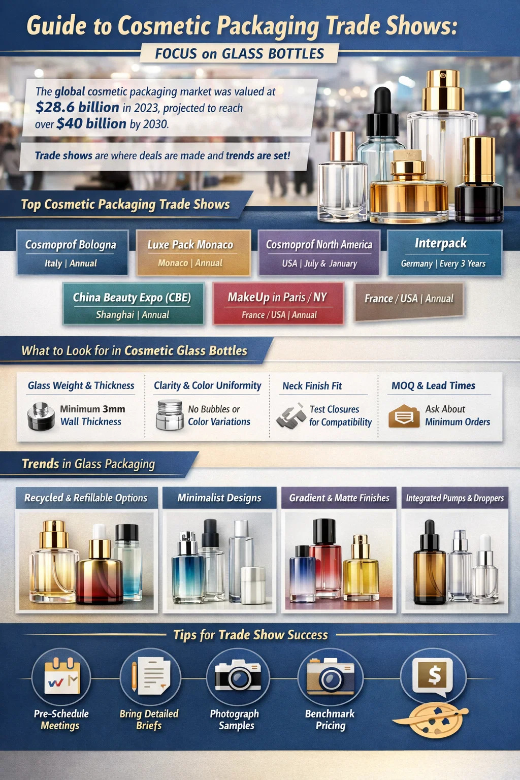 Ovaj članak pokriva glavne sajmove kozmetičke ambalaže vrijedne vašeg vremena, kako im pristupiti strateški, na što obratiti pozornost pri nabavi kozmetičkih staklenih boca i srodnih materijala te kako nekoliko dana na sajmu pretvoriti u trajnu poslovnu vrijednost.