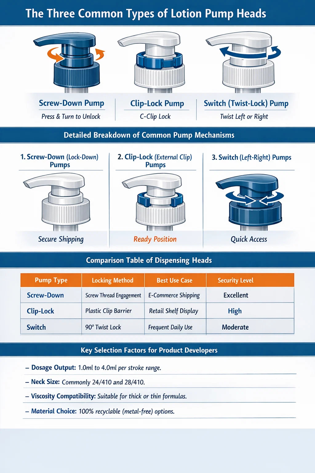 U ambalažnoj industriji, pojam Koje su tri uobičajene vrste pumpi? posebno se odnosi na mehanizme za zaključavanje i doziranje koji se koriste za osiguranje tekućina. Tri najzastupljenija tipa su Navojne pumpe, Clip-lock pumpe i Prebacite (Twist-lock) pumpe . Svaki je dizajniran za sprječavanje istjecanja tijekom transporta, a istovremeno pruža specifično korisničko iskustvo tijekom svakodnevne primjene.